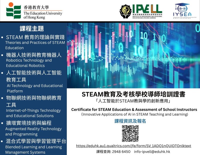 This course is co-organized by the Institute for Professional and Vocational Education and Lifelong Learning (IPVELL) of The Education University of Hong Kong and the International Youth STEAM Education Association (IYSEA). It is specifically designed for school teachers and leaders, with the goal of exploring the philosophy of STEAM education, various teaching methods, and its application within Hong Kong’s educational environment. Participants will gain skills in designing innovative STEAM activities through technologies such as robotics, artificial intelligence, the Internet of Things, and augmented reality. The course also covers blended learning models, student-centered teaching strategies, and effective assessment tools to help foster creativity, critical thinking, and collaborative skills.