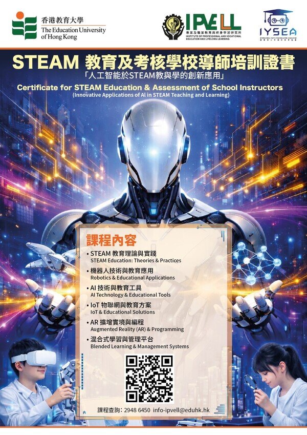 本課程是由香港教育大學專業及職業教育與終身學習研究所 (IPVELL) 與國際青少年創科教育協會 (IYSEA) 合辦,專為學校教師和領導設計,旨在探討 STEAM 教育的理念、教學法及其在香港教育環境中的應用。參加者將透過學習機器人、人工智能、物聯網及擴增實境等技術,掌握設計創新 STEAM 活動的技能。課程同時涵蓋混合式學習模式、以學習者為中心的教學策略及有效的評估工具,幫助培養創造力、批判性思維及協作能力。